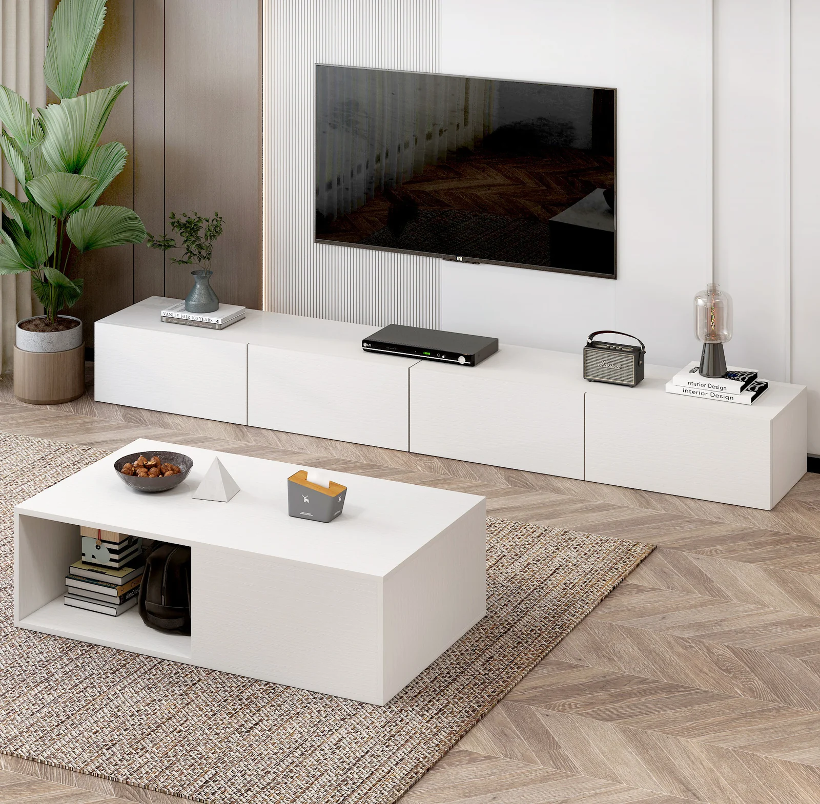 2-Piece Set Lusso Designer Wooden Coffee Table & 2.4m TV Cabinet (White)