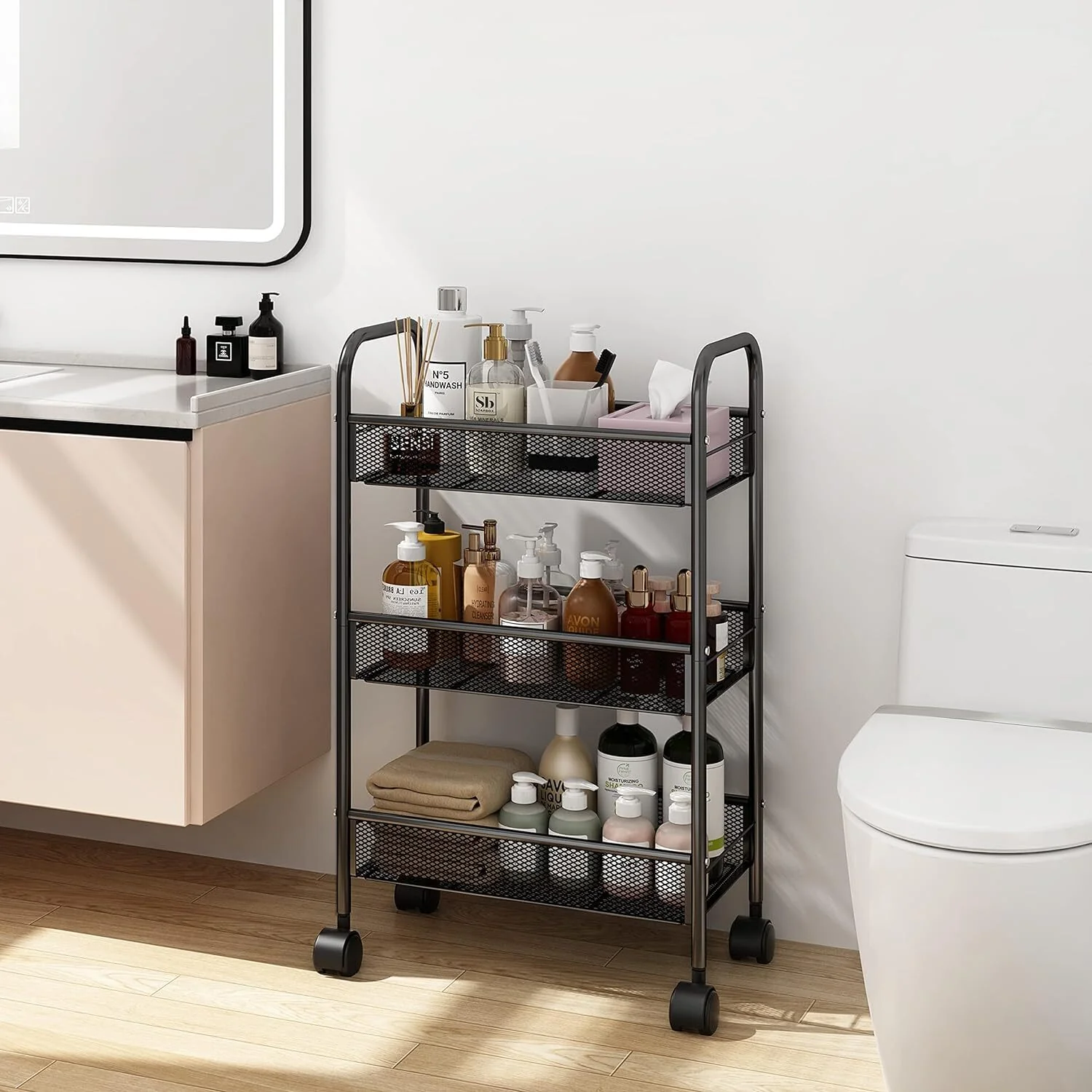 Sturdy Elegance: Three expansive shelves with premium iron construction offer a sleek stage for your kitchenware, bath essentials, or decorative items, ensuring stability and strength.