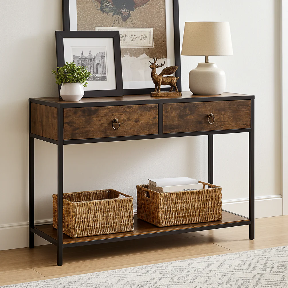 Bring effortless charm and practical style to any space with this rustic console table, a striking blend of vintage warmth and modern sophistication. Featuring a distressed timber-look finish, a sleek black metal frame, and elegant gold-toned ring handles, this console is designed to elevate your hallway, entryway, living room, kitchen, or bedroom. Its minimalist silhouette and earthy tones make it a versatile statement piece that complements a wide range of interiors, from contemporary to farmhouse and beyond.